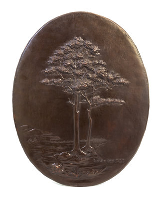 of oval form decorated with trees in a landscape and stamped Completed March 10th 1930.