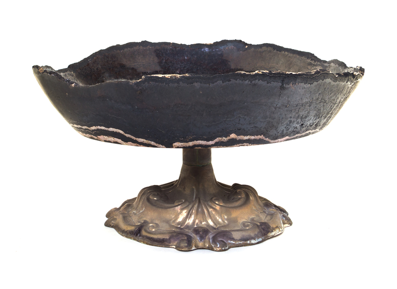 the circular bowl with a rough hewn edge raised on a shaped base modeled with relief scrolls.