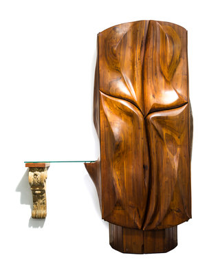 circa 1967, with four doors opening to an illuminated interior and glass shelves, mounted throughout with found objects.