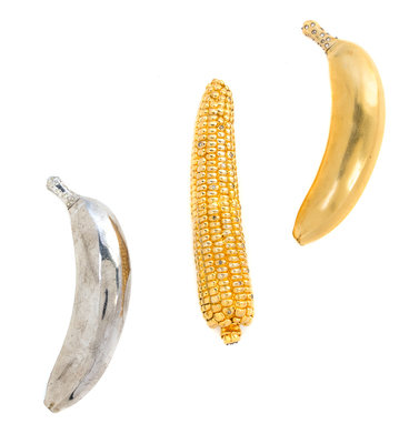 two in the form of bananas with hinged lids and one in the form of a corn cob with a screw-off lid, each set with rhinestones.