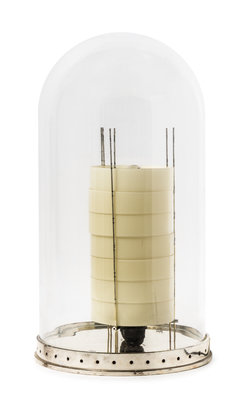 with two lights enclosed by a diffuser comprising stacked glass rings under a dust dome.