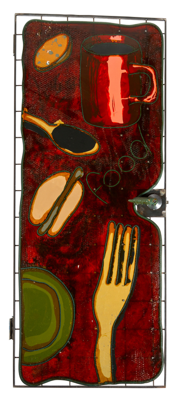 depicting stylized utensils in sculpted resin against a grid.