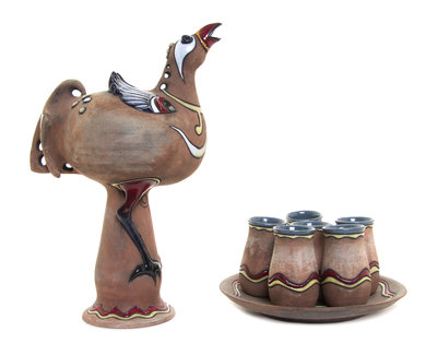comprising a figural pitcher and six cups, the tray signed indistinctly.
