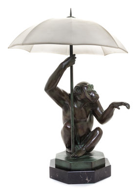 in the form of a seated monkey supporting a frosted glass umbrella shade.