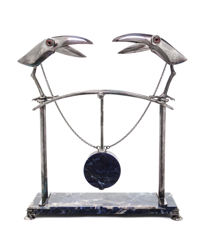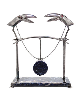 depicting two stylized toucans joined by chains to a central pendulum, on a rectangular base with disk feet.