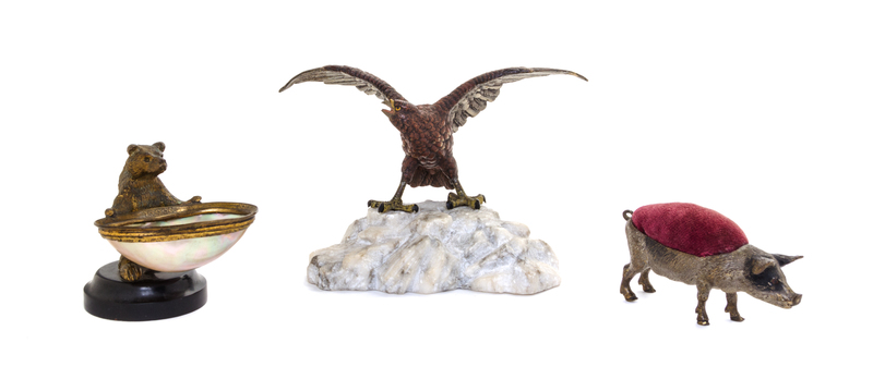comprising a bird of prey mounted on a carved stone base, a standing bear holding an abalone shell bowl and a pig-form pin cushion.