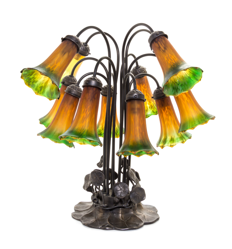 A Bronzed Metal and Glass Twelve-Light Tulip Lamp