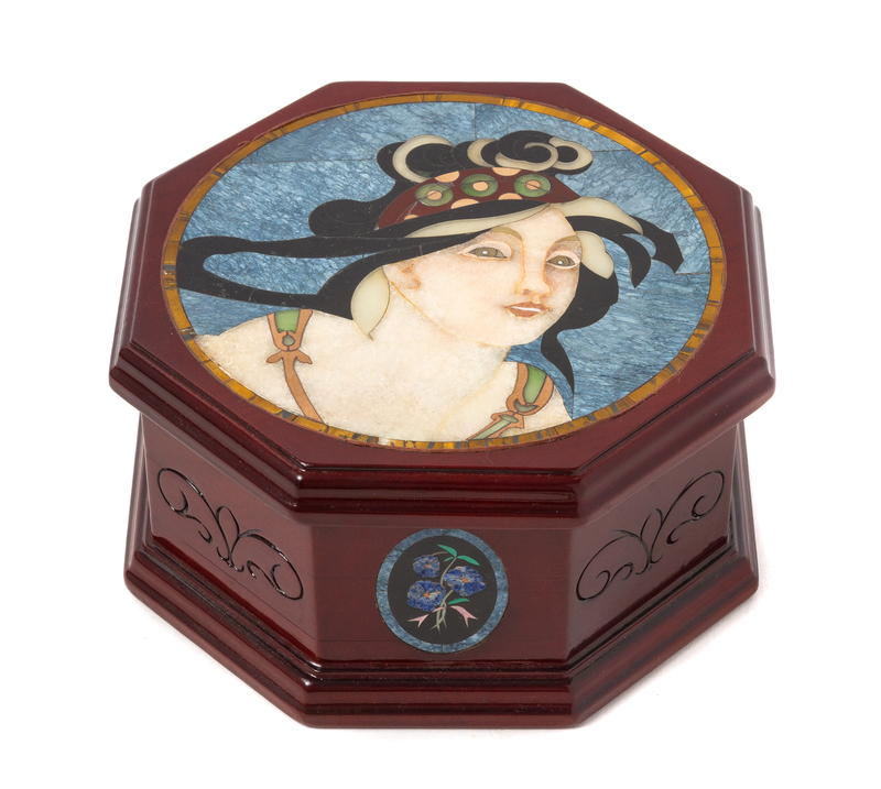 of octagonal form, the hinged lid inlaid to show a woman, with floral plaques at the sides.