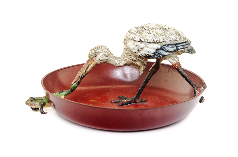 of circular form with a egret attacking a frog, the egret with a hinged door on its back revealing a match strike.