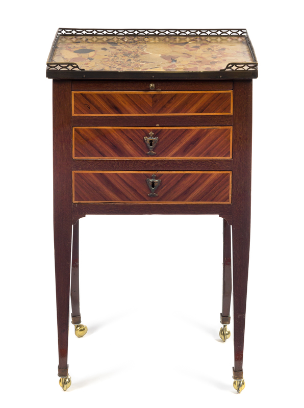 with a rectangular three-quarter galleried breche d'alep marble top over a leather-inset writing slide and two drawers, raised on square tapering legs ending in casters.