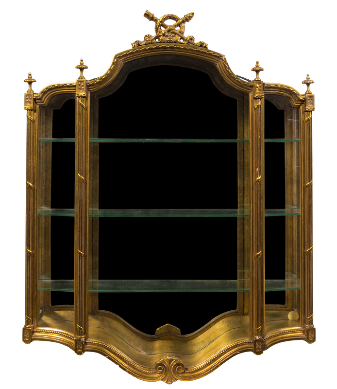 with a torch and wreath crest over a glazed front opening to shelves and open niches at the sides, all spaced by reeded columns.