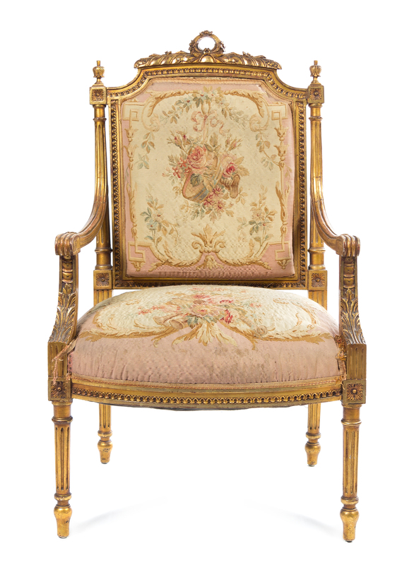 with a carved wreath crest above a padded tapestry upholstered seat decorated with a musical trophy, the stuffover seat similarly decorated, raised on fluted tapering legs.