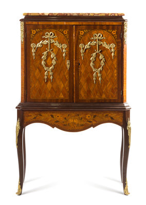 A Louis XV/XVI Transitional Style Gilt Bronze Mounted Parquetry Cabinet