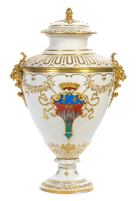 of lidded baluster form, both sides modeled with a raised coat-of-arms and lion mask handles at the shoulder, highlighted in gilt.