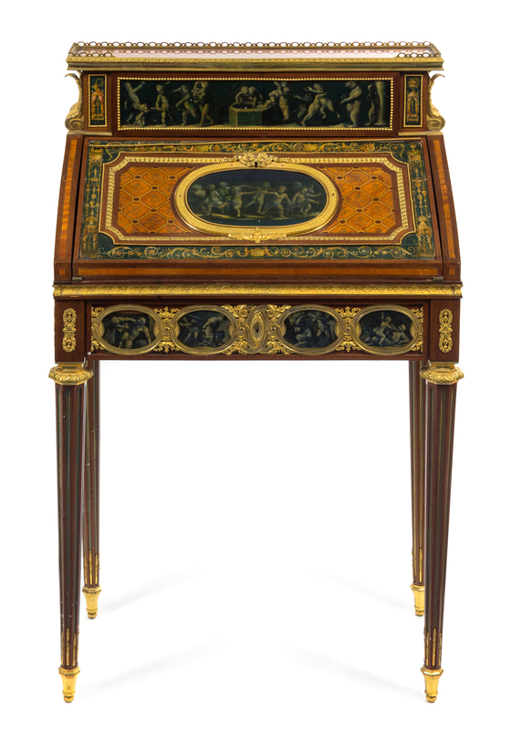 the upper section having a rectangular three-quarter galleried top above a painted panel depicting exuberant putti dancing around a well, the drop-down writing surface inset with an oval plaque depicting a band of dancing putti and having a painted Neoclassical border, the interior fitted with a series of drawers and compartments over a monogrammed leather inset writing surface and a frieze drawer, raised on fluted tapering legs ending in toupie feet.