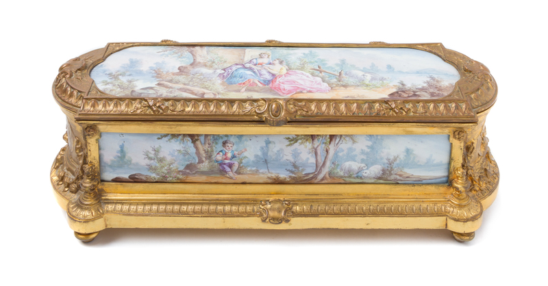 of rectangular form with rounded ends, the lid and sides decorated with couples in bucolic landscapes.