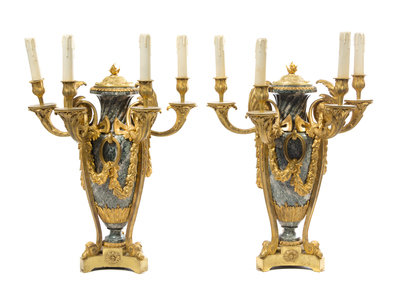A Pair of Napoleon III Gilt Bronze and Marble Four-Light Candelabra