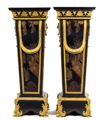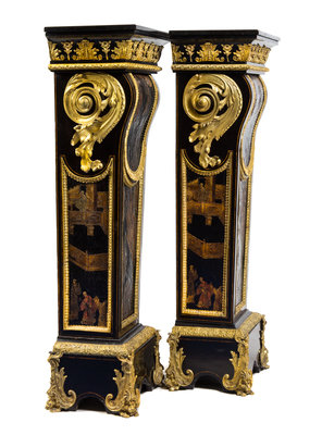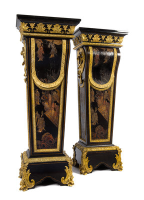 A Pair of Napoleon III Gilt Bronze Mounted and Coromandel Lacquer Inset Ebony Pedestals