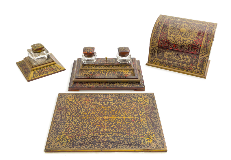 comprising a standish with twin inkpots, an inkwell with a single pot, a stationery box and a rectangular panel.