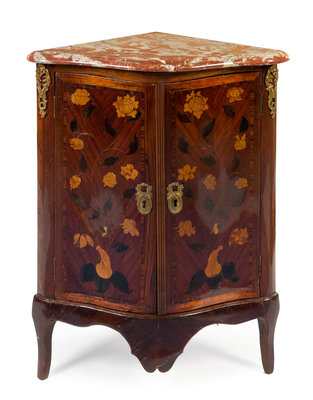 A Louis XV Style Gilt Bronze Mounted Marquetry Encoignure
