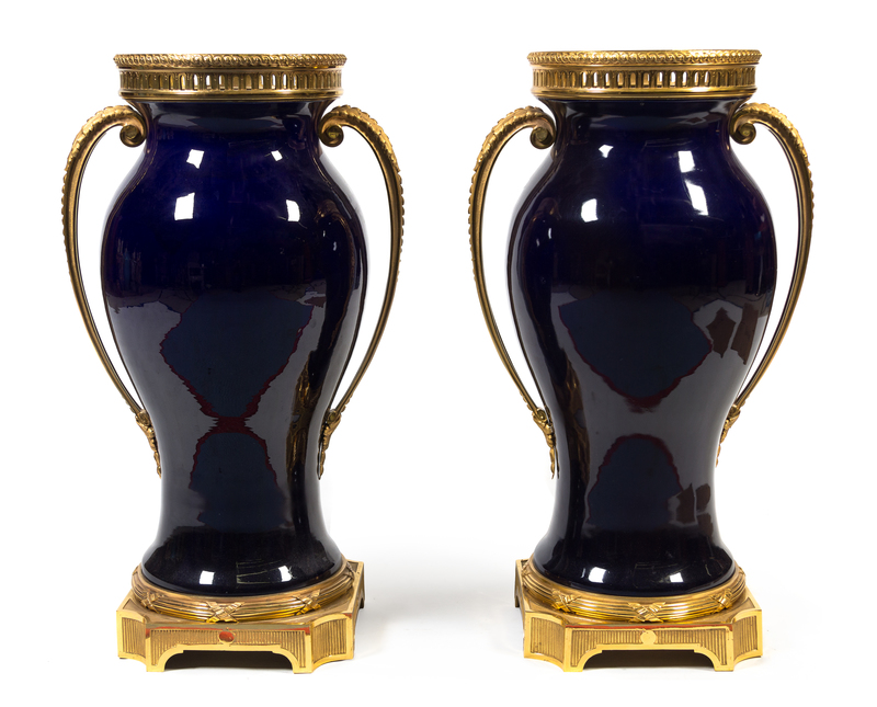 A Pair of French Gilt Bronze Mounted Cobalt Glazed Ceramic Urns