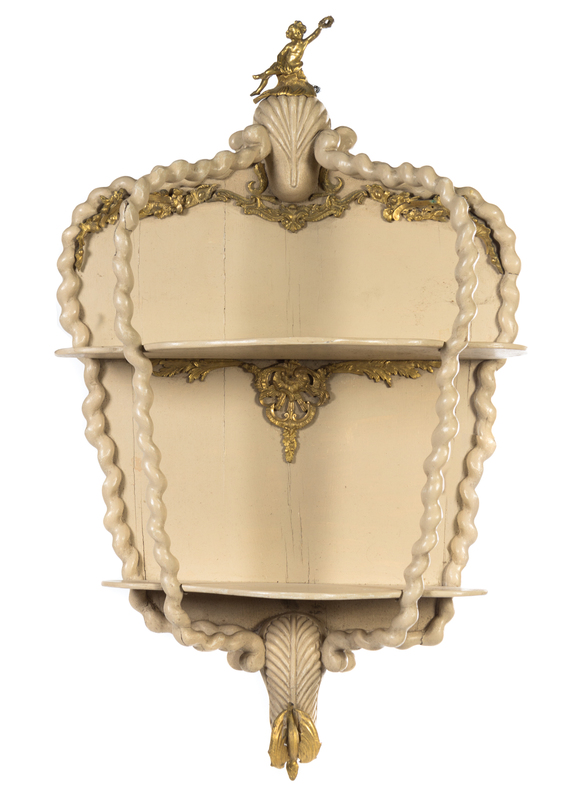each with two shaped tiers, mounted at the top with a putto holding a wreath and at the bottom with a dragon.