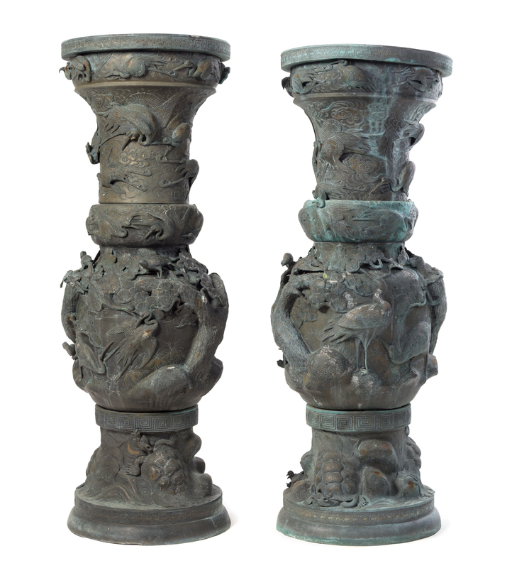 each cast in high relief with cranes among swirling clouds, birds perched on trees and tortoises.