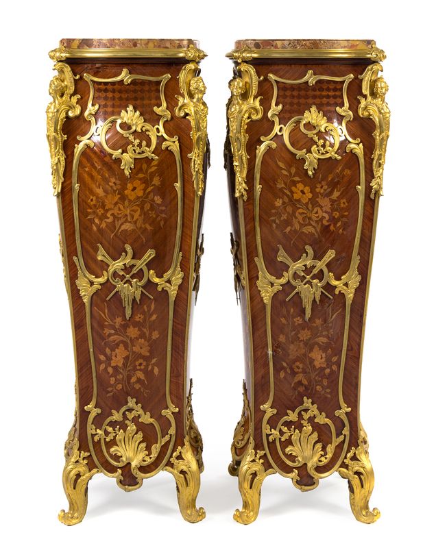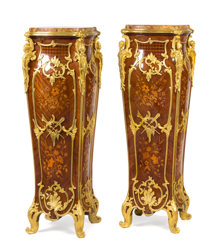 A Pair of Louis XV Style Gilt Bronze Mounted Marquetry Pedestals