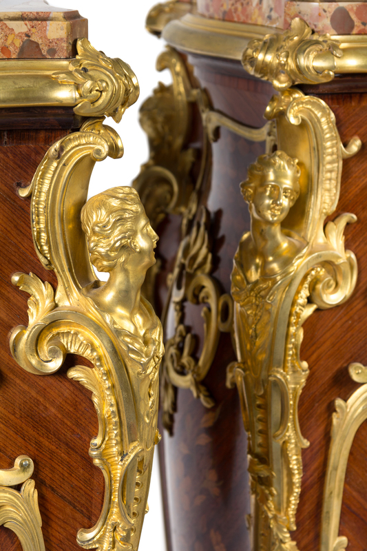 each having a shaped rectangular breche d'alep marble inset top, the pedestals of bombe form with female busts at all four corners, inlaid througout to show ribbon-tied bouquets with trophy and icicle mounts, raised on foliate scroll legs.