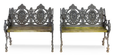 A Pair of Victorian Painted Iron Double-Back Garden Benches