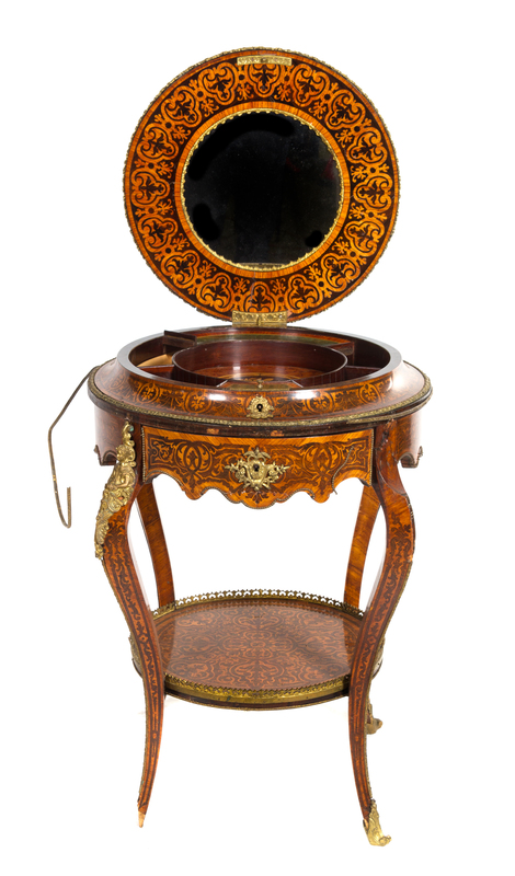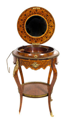 the circular hinged top opening to a fitted and mirror-inset interior, raised on cabriole legs headed by female busts, joined by a medial shelf and ending in sabots.