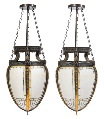 A Pair of Large Gilt Bronze and Glass Hanging Lanterns