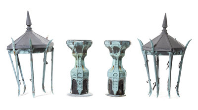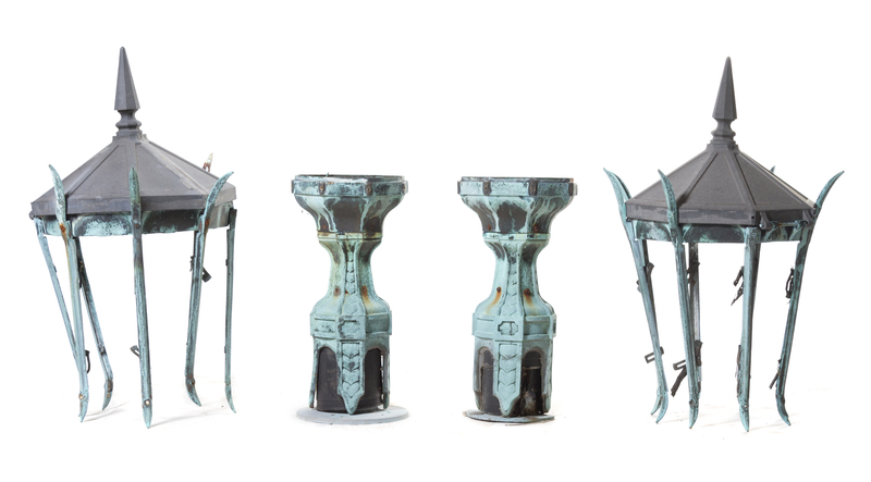 A Pair of Patinated Cast Metal Lanterns