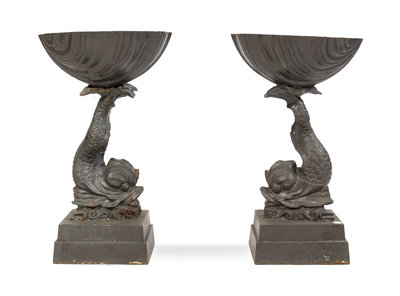 each with a shell form bowl supported by a dolphin on a rectangular base.