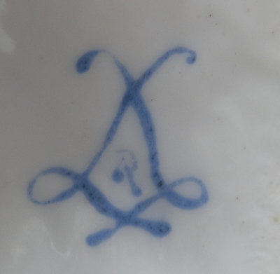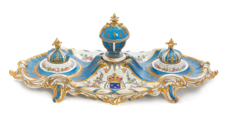 having three inkpots, painted with floral garlands and Marie Antoinette's monogram, the underside marked with interlaced Ls centered with an R.