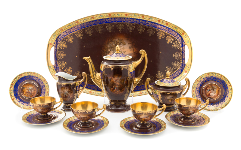 comprising a tray, four cups with six saucers, a coffee pot, a creamer and a covered sugar, each with transfer printed and gilt decoration.