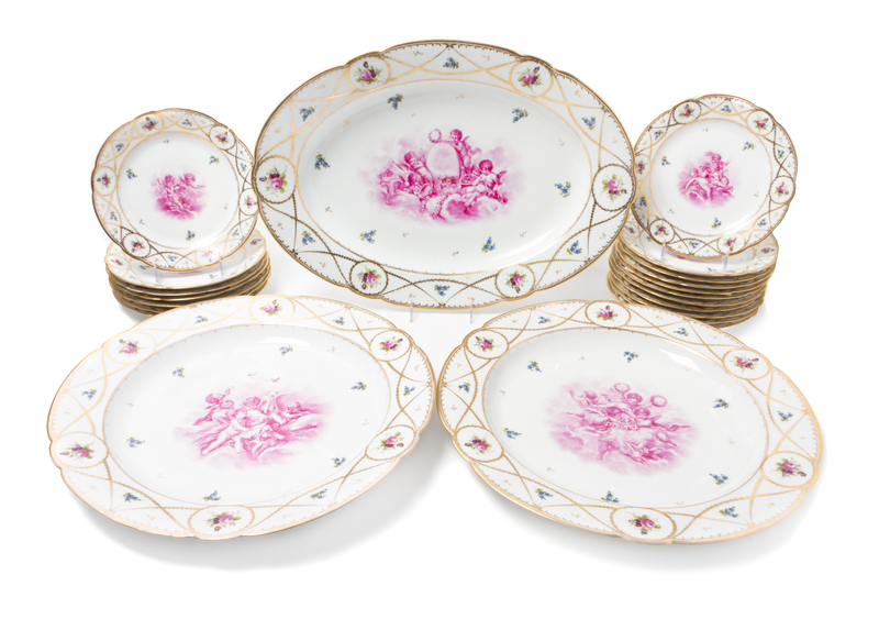 comprising eighteen plates, an oval platter and two large circular platters, each painted at the center with a puce depiction of putti among clouds within gilt and floral borders, having underglaze blue fish marks to the undersides.