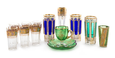 including Moser and other examples, comprising a teacup and saucer and eleven tumblers of varying size form.