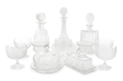 comprising a set of five glasses, a set of two glasses, three decanters and two butter dishes.