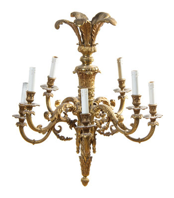 with a torch-form standard issuing S-scroll candle arms and plumes at the top.
