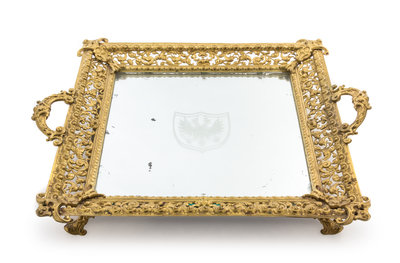 having a pierced border with handles, inset with a mirrored surface etched with a double-headed eagle.