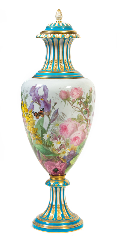 the lid with a pine cone finial, the body of baluster form with celeste blue bands and painted roses, irises, lily of the valley and various insects with gilt highlights, the underside of the lid marked Exposition Universelle Paris 1878.