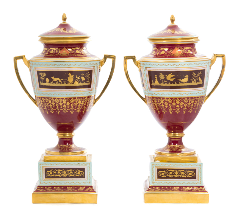 A Pair of Royal Vienna Porcelain Urns, Covers and Stands