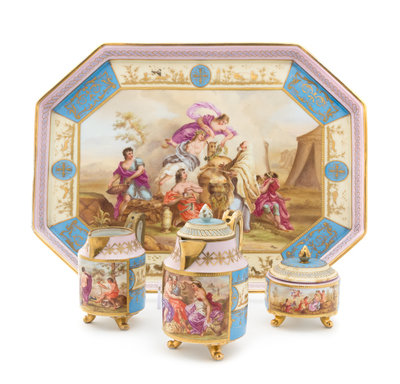 comprising a small teapot, a creamer, a covered sugar and a tray, each painted with scenes from mythology, titled on the reverse, and gilt-highlighted pink, blue and beige grounds.