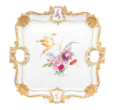 of rectangular handled form, painted at the center with a bouquet of flowers within gilt foliate and shell borders.