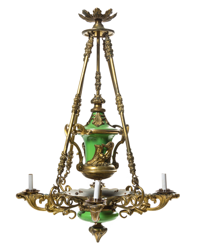 with cornucopia candle arms suspended from four rods surrounding a two-part glass standard.