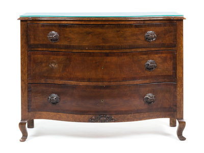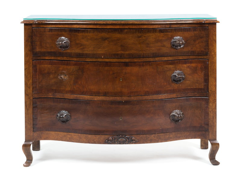 having a serpentine front top over an arrangement of three drawers, raised on short cabriole legs.