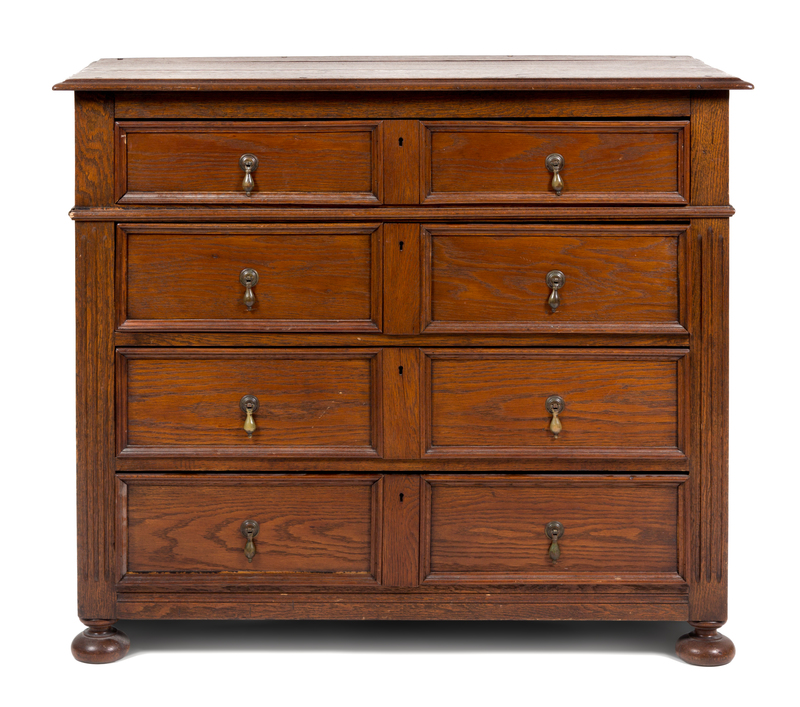 having a rectangular top and four drawers with brass pulls, raised on flattened spherical feet.