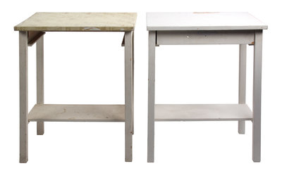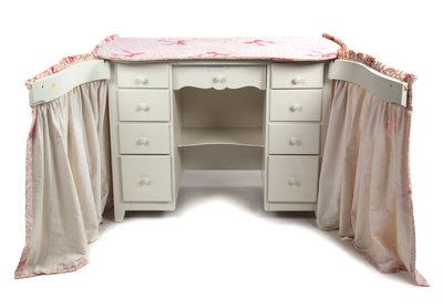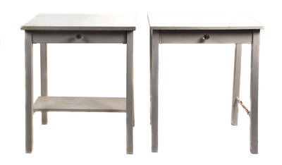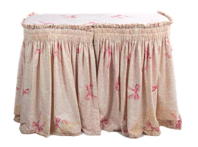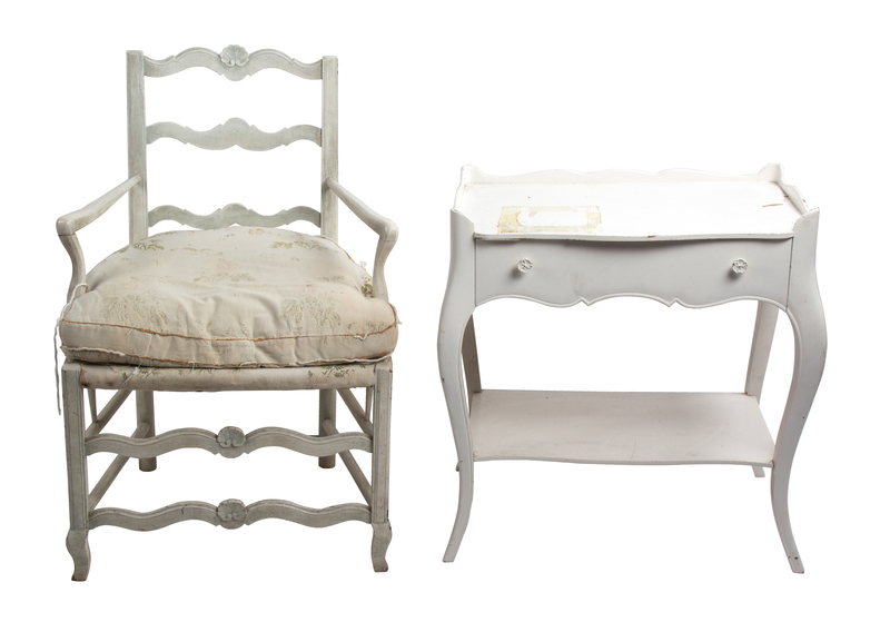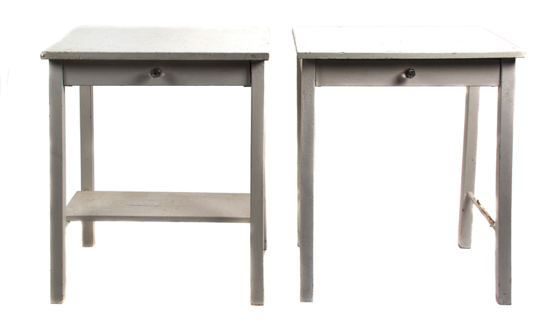comprising four tables, a white painted end table with raised shelf, a white painted ladder back arm chair and a dressing table with pink and white skirt from Rose Kennedy's bedroom.