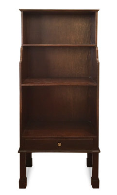 having a rectangular top abover three shelves with shaped sides, over a shallow drawer, raised on square legs ending in block feet.